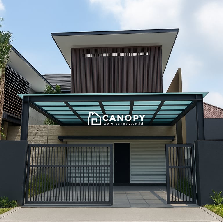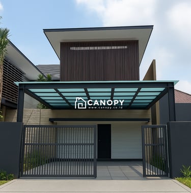 Kanopi kaca dengan desain modern dan kuat, cocok untuk hunian maupun bangunan komersial. Memberikan perlindungan tanpa mengurangi pencahayaan alami.